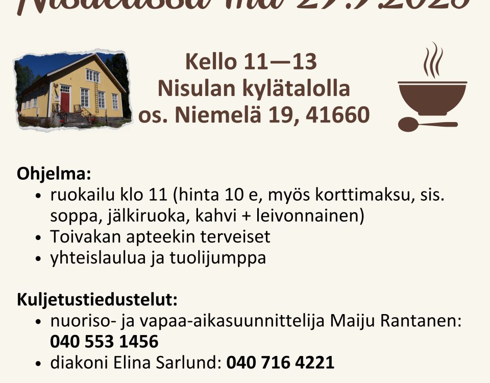Kello 11—13Nisulan kylätalollaos. Niemelä 19, 41660 Ohjelma:ruokailu klo 11 (hinta 10 e, myös korttimaksu, sis.