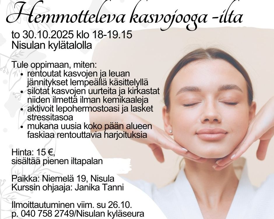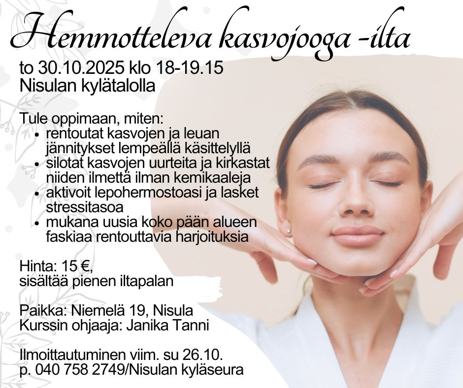 to 30.10.2025 klo 18-19.15 Nisulan kylätalolla Tule oppimaan, miten:rentoutat kasvojen ja leuan jännitykset lempeällä käsittelylläsilotat