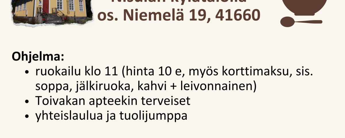 ruokailu klo 11 (hinta 10 e, myös korttimaksu, sis. soppa, jälkiruoka, kahvi + leivonnainen)
