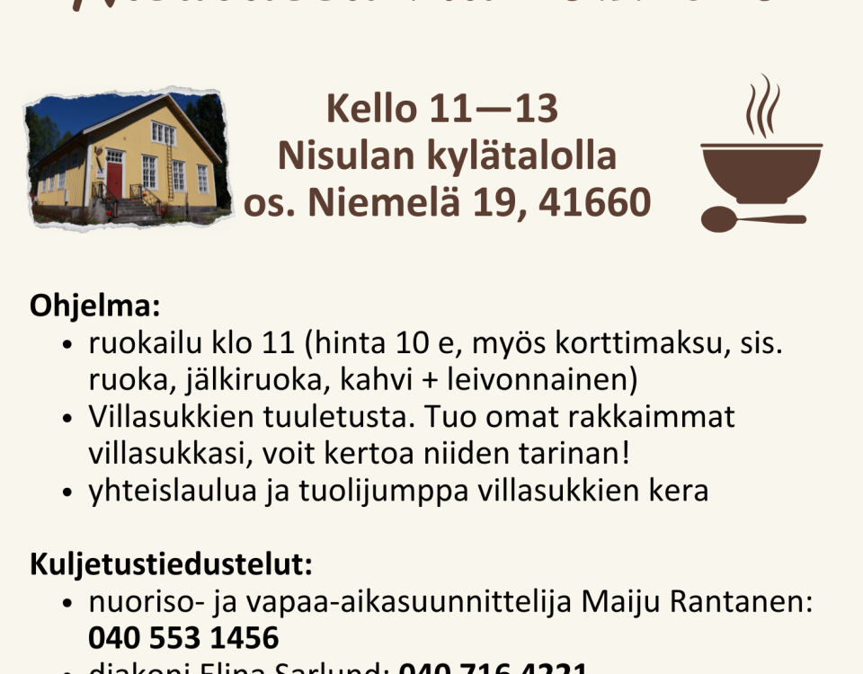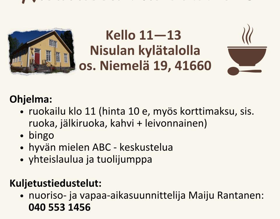 Kylällämme asuu n. 150 henkilöä, kesällä asukasmäärä kolminkertaistuu.Kaunis luonto on yksi silmiinpistävä piirre, kylällä on Päijänteen rantaviivaa kymmeniä kilometrejä. Lisäksi Nisulassa on Vihijärvi ja metsiä värittää lukuisat pienet lammet. Kylän kokoontumis- ja juhlapaikka on kylätalo. Harvinaisuutena kylässämme on perinnemaisema Vaaterin niityt.