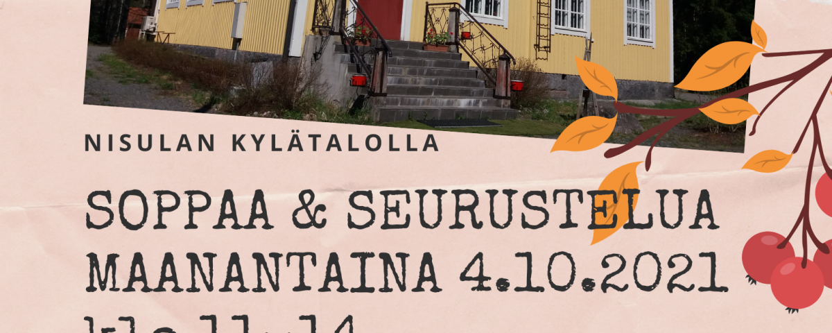 Soppaa ja seurustelua Nisulassa ma 26.1.2026 klo 11-13 Nisulan kylätalolla os. Niemelä 19, 41660